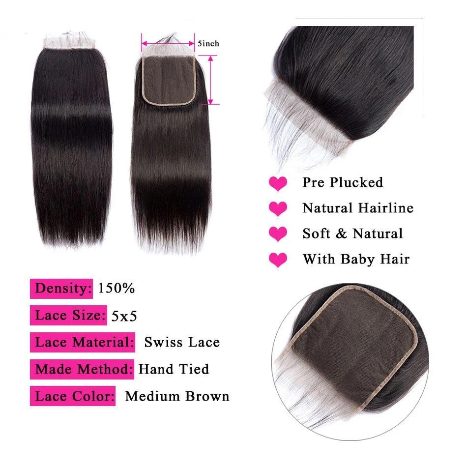 5×5 HD Lace Closure With Bundles Peruvian Straight Bundles 12-32 Inch Long Human Hair Weave Bundles With 4x4Lace Closure