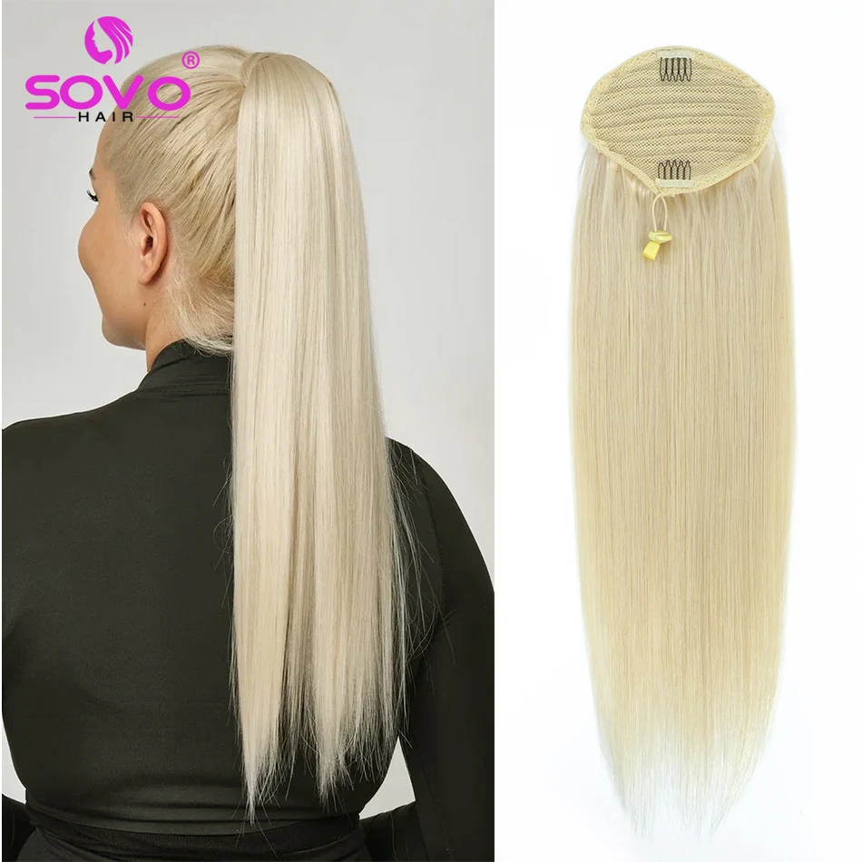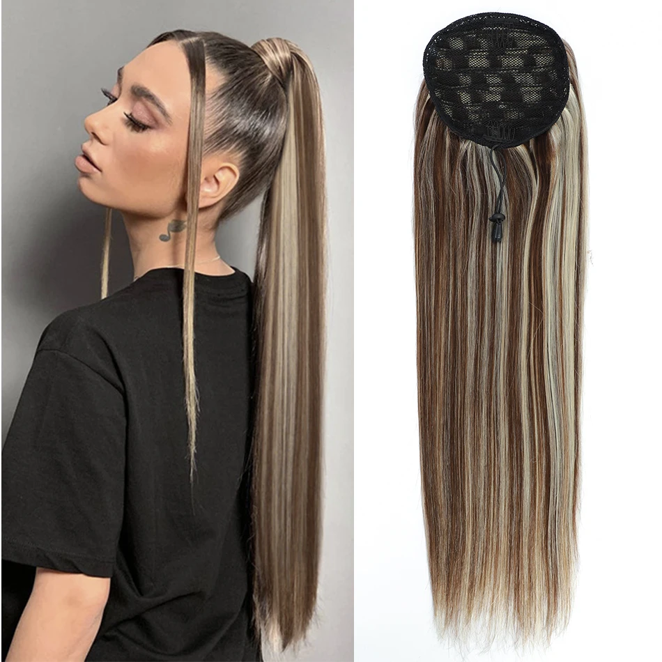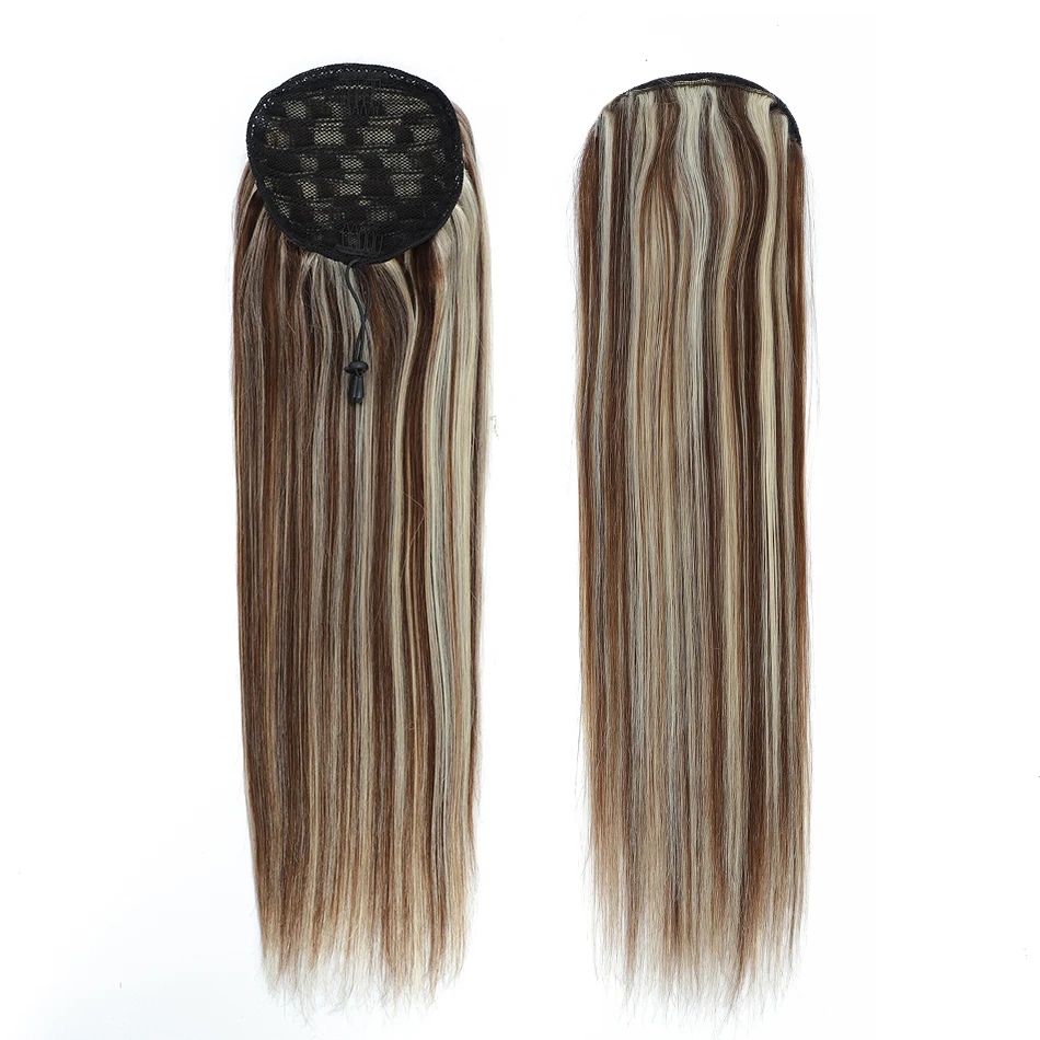 Remy Drawstring Human Hair Ponytail: Straight, Blond Highlight Ombre