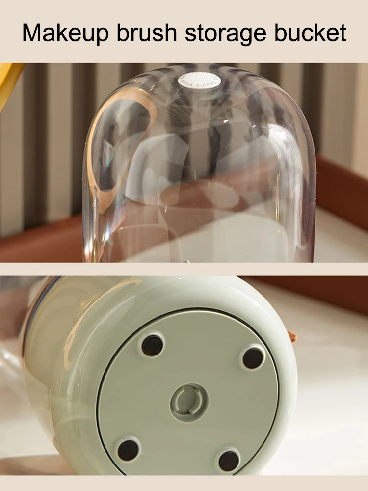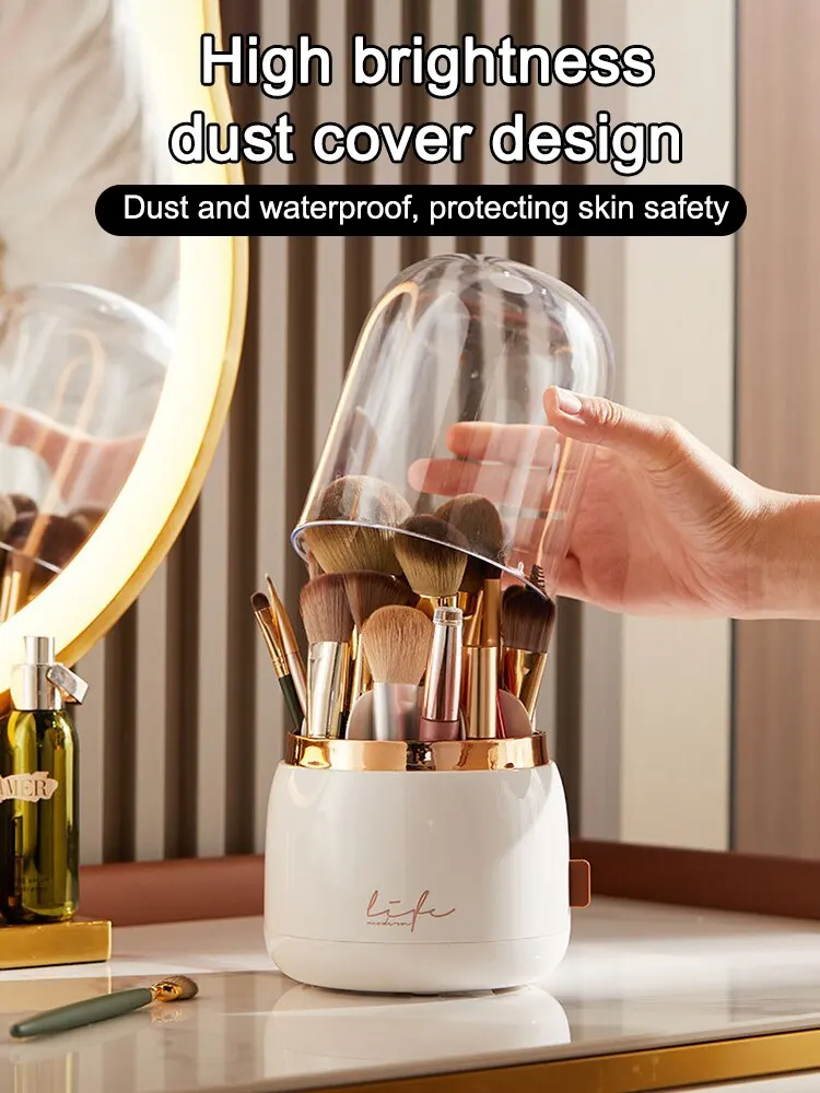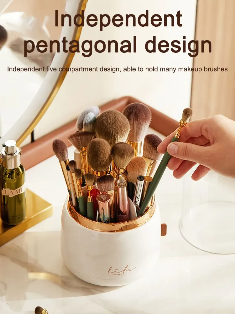 Super container for brushes, it has a lot of compartments and they will pull off the lid, which is thick plastic. The container rotates freely, I strongly recommend